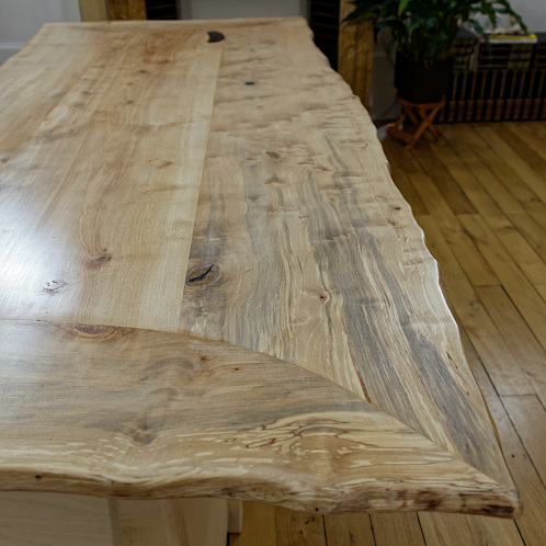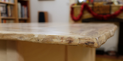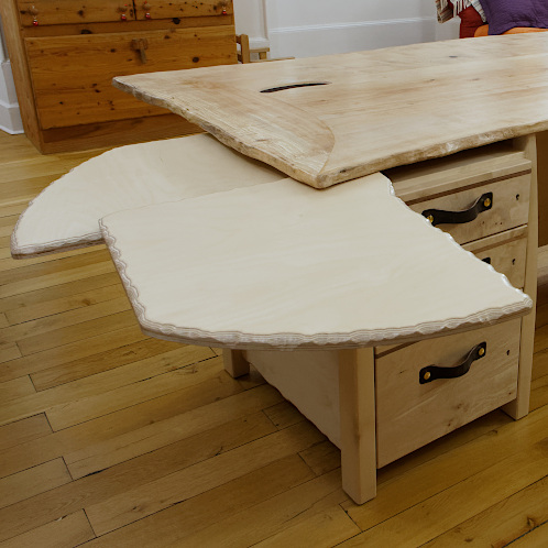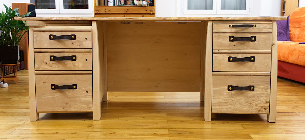 Desk for the medical Doctor, designed in 2019. Wood is mainly Birch and Sycamore tree, with a few inserts of Olivier, Walnut and leather.