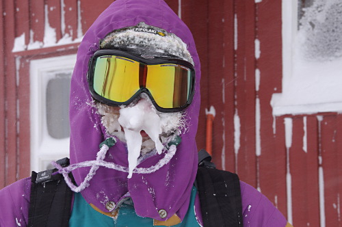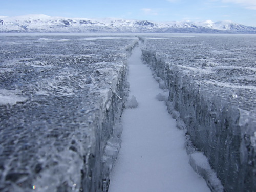 | (myself) Reaching the mountain hut after three hours fighting for our way in a windy snow storm. | A crack in the ice while crossing frozen lake Torneträsk north of Abisko, Sweden. |