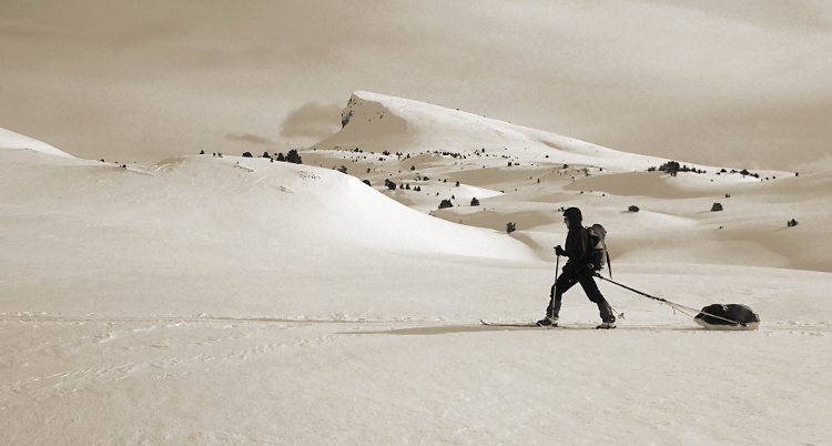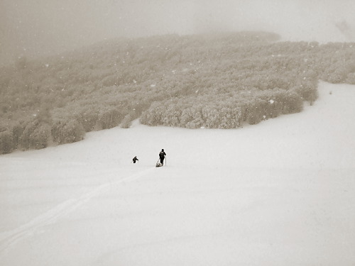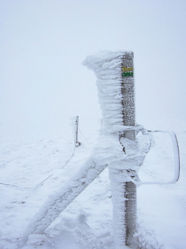 | A quite cold winter for ski hiking around all Vercors. Even sign posts are frozen. | Two days later, during light snowing. 1/450s exposure, B&W and sépia post-processing. |